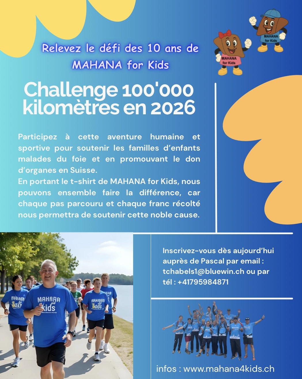 Individuellement, en couple, en famille, entre amis ou en équipe, en marchant ou en courant, notre défi est de parcourir ensemble 100'000 kilomètres en 2026.